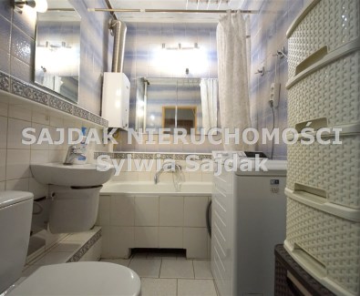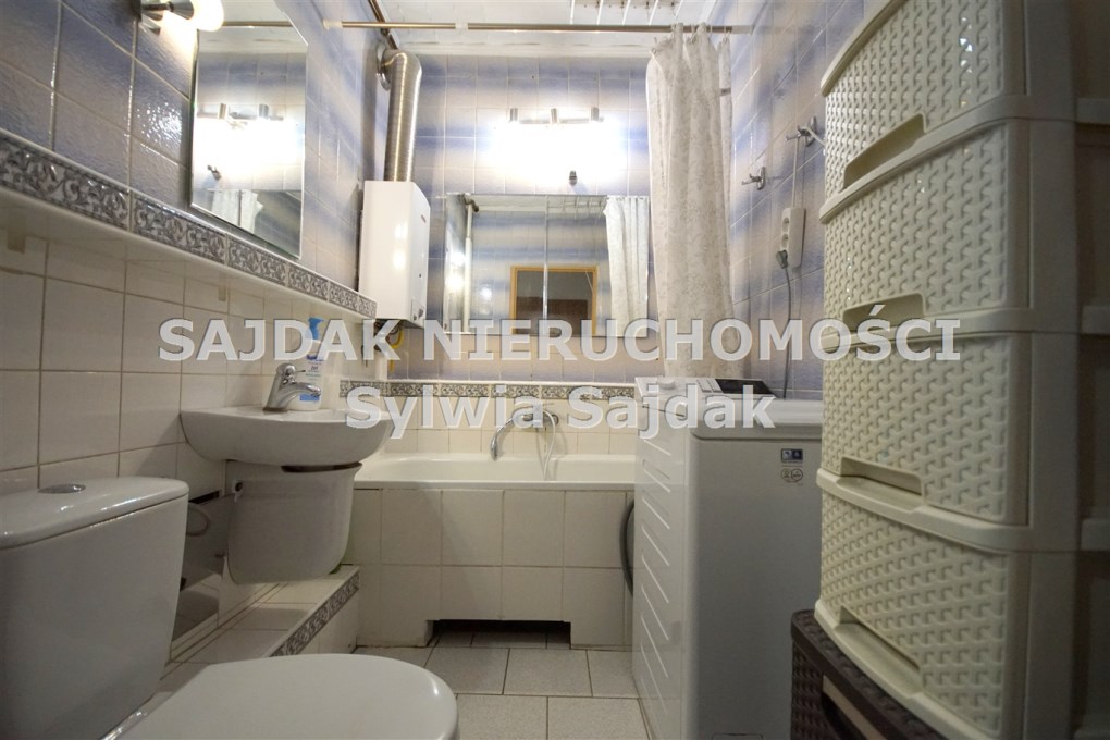 * łazienka z wanną, sanitariami oraz pralką.